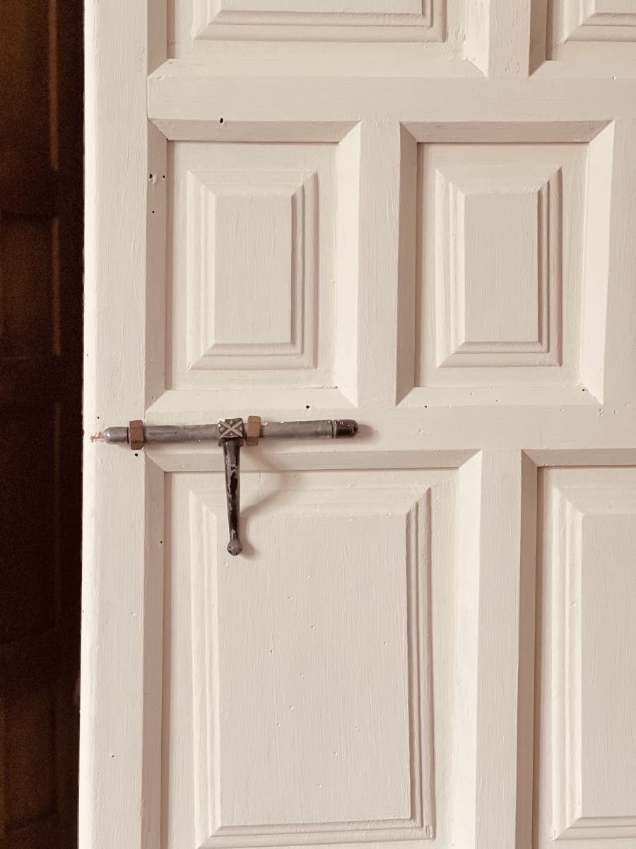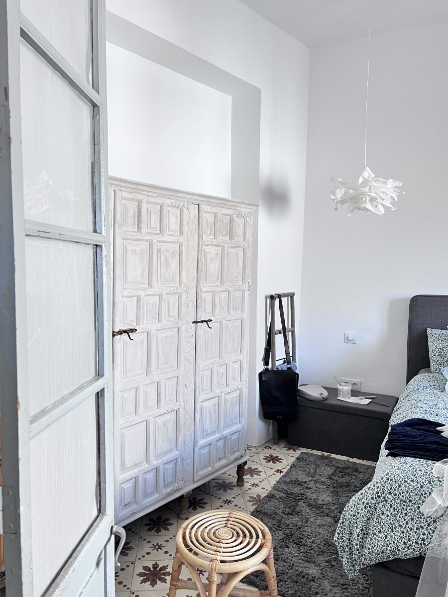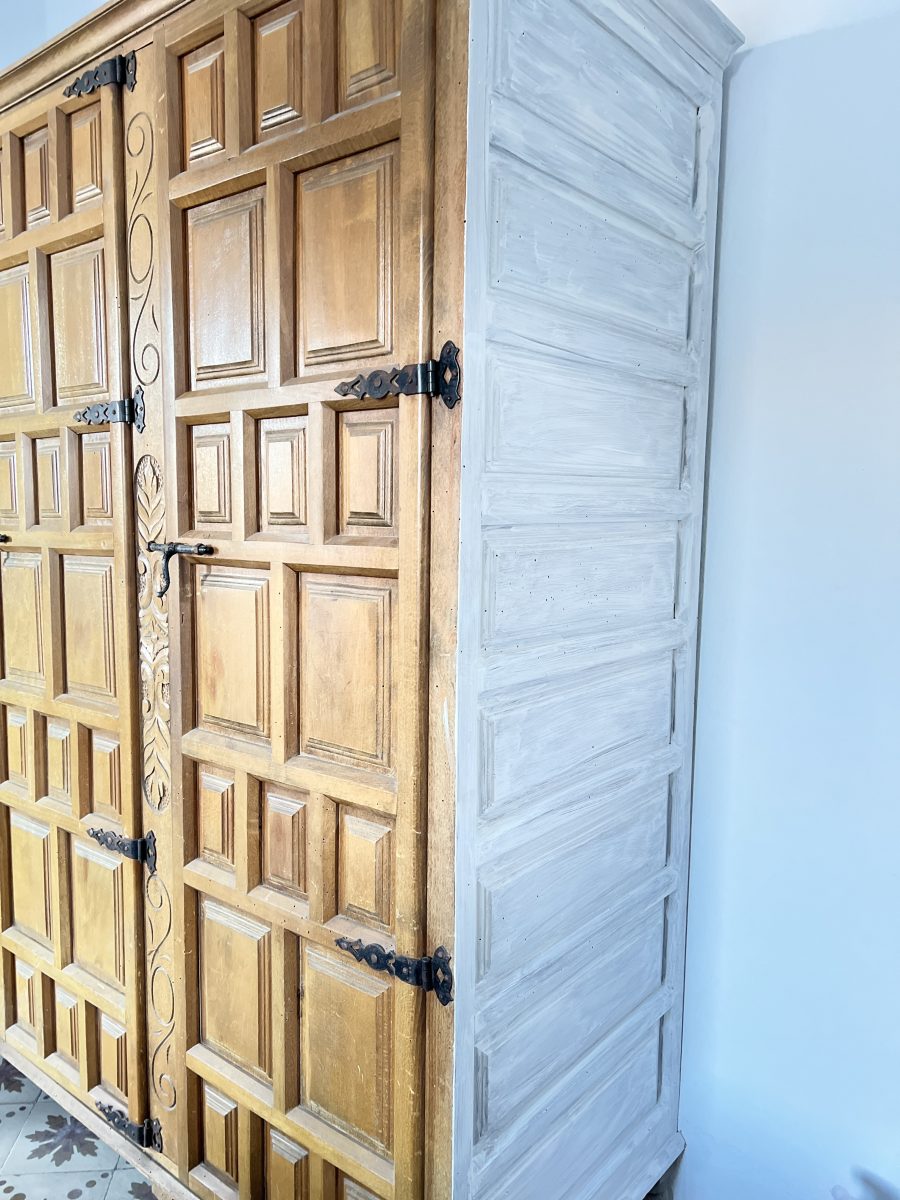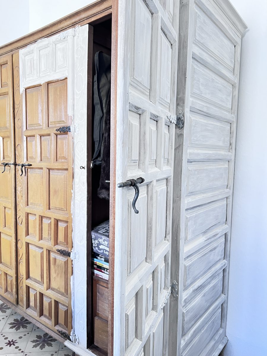 It’s been a godsend of a storage space, since all of our belongings came out of storage, as we’ve been able to pack lots inside. But we knew we wanted to spruce it up, because the wood, as beautiful as it is, was just too dark for us. The house is now very light and bright, and we definitely wanted to take this piece of furniture a whole lot lighter – not white, but something that would complement the white walls and ceiling of the bedroom. I’d bought a chalkpaint called Frappe for a mirror, and really liked the creaminess of the colour – light, but warm. So, it was decided that this was the colour. And, what a result. A beautiful new wardrobe, which looks a whole lot better.