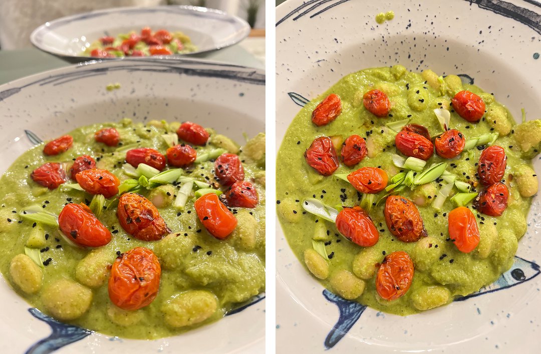 As winter takes hold, this is a super delicious winter warmer – Fresh Pea & Mint Pesto with Butter Beans & Roasted Tomatoes. And, as far as I can tell, it’s vegetarian and suitable vegans if the Greek yogurt is omitted and maybe an alternative used – although I do stand to be corrected on the vegan front.