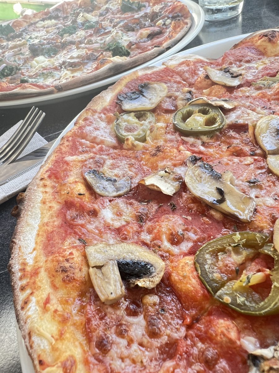 The very thin, stretched Romana bases are perfect – much less doughy and much less filling. Topped to perfection, too – American Hot (the jalapenos did have quite the kick!) with extra mushrooms and a Padana were just what we needed, along with a vino and a cold beer. I think we’re maybe just far away for home delivery, but I don’t think we can really complain when get to enjoy pizzas in the sunshine, like this.