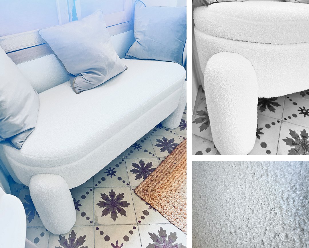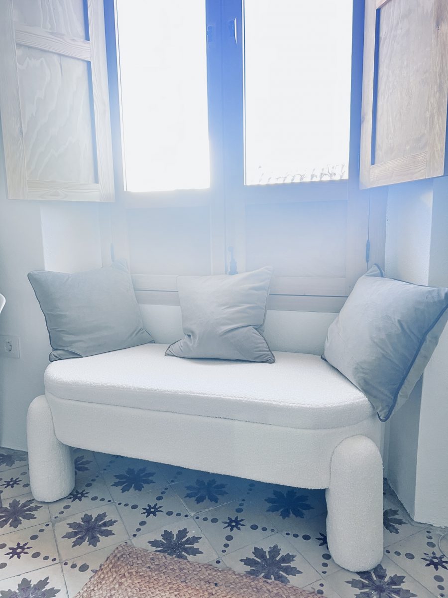 But I’ll come back to the curtains and the bedroom, because they are not what this about. No, this about finding that perfect something for underneath the window. Out of which we have the most gorgeous view, over the terracotta roof tiles of the houses opposite and away to the mountains to the east, towards Malaga. The view changes throughout the day, and as we’re discovering, across the seasons, and this little space is the perfect place to just sit, and take it all in. So, instead of being perched on a random spare chair, I wanted something beautiful, which would add to the bedroom, not be a spare part. A lot of online searching led me to this beauty – a slightly off-white, soft boucle bench, with big thick, chunky legs, and which is the exact size for under the window. And when I say exact, it couldn’t have been any more perfect. Snug. Perfect. But best of all, it also has a hinged seat with quite a good sized bit of storage – meaning that the bedding for this room can be stored in the bench. So no confusion going forward!
