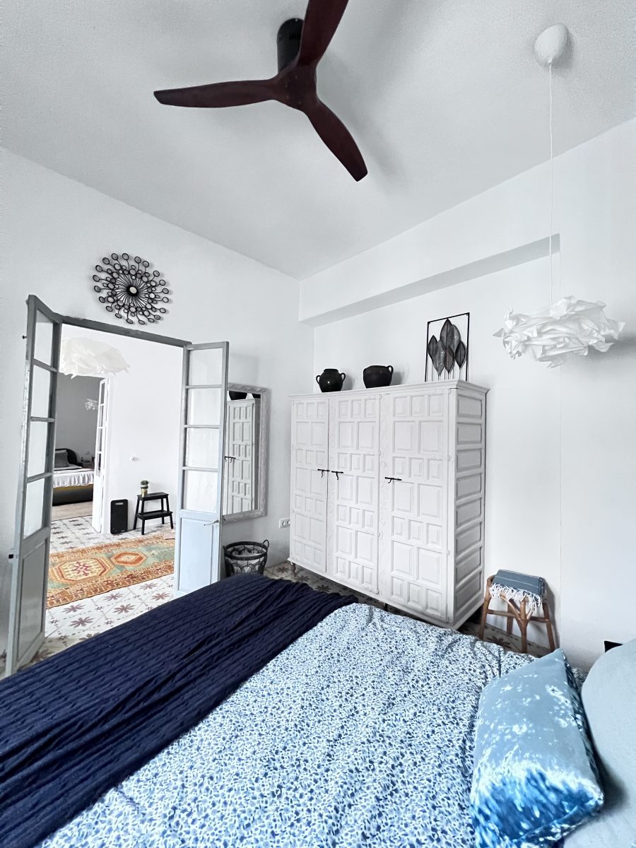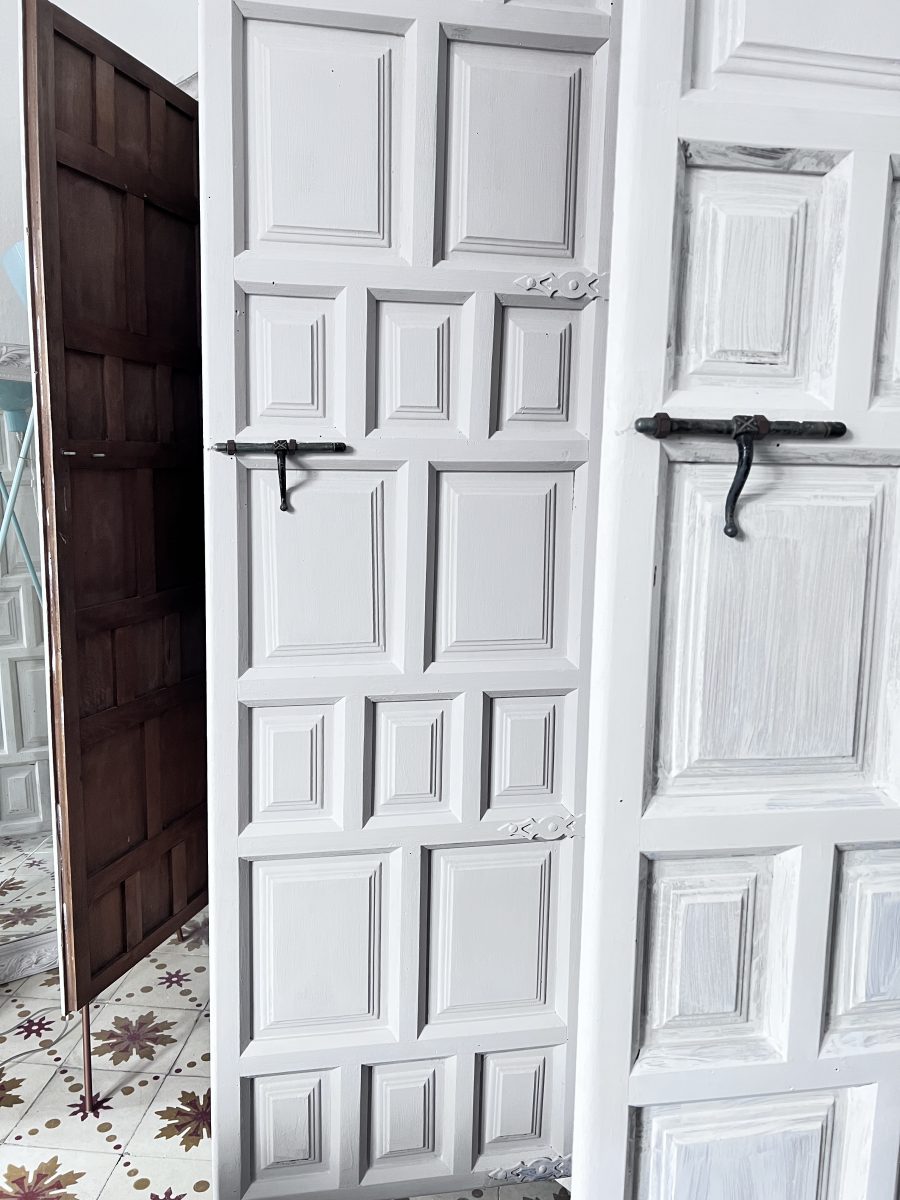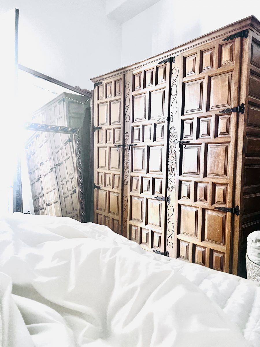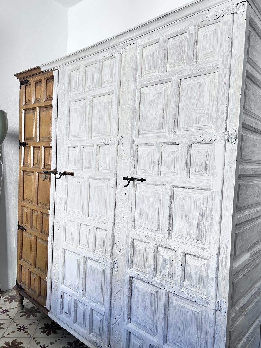 It’s been a godsend of a storage space, since all of our belongings came out of storage, as we’ve been able to pack lots inside. But we knew we wanted to spruce it up, because the wood, as beautiful as it is, was just too dark for us. The house is now very light and bright, and we definitely wanted to take this piece of furniture a whole lot lighter – not white, but something that would complement the white walls and ceiling of the bedroom. I’d bought a chalkpaint called Frappe for a mirror, and really liked the creaminess of the colour – light, but warm. So, it was decided that this was the colour. And, what a result. A beautiful new wardrobe, which looks a whole lot better.